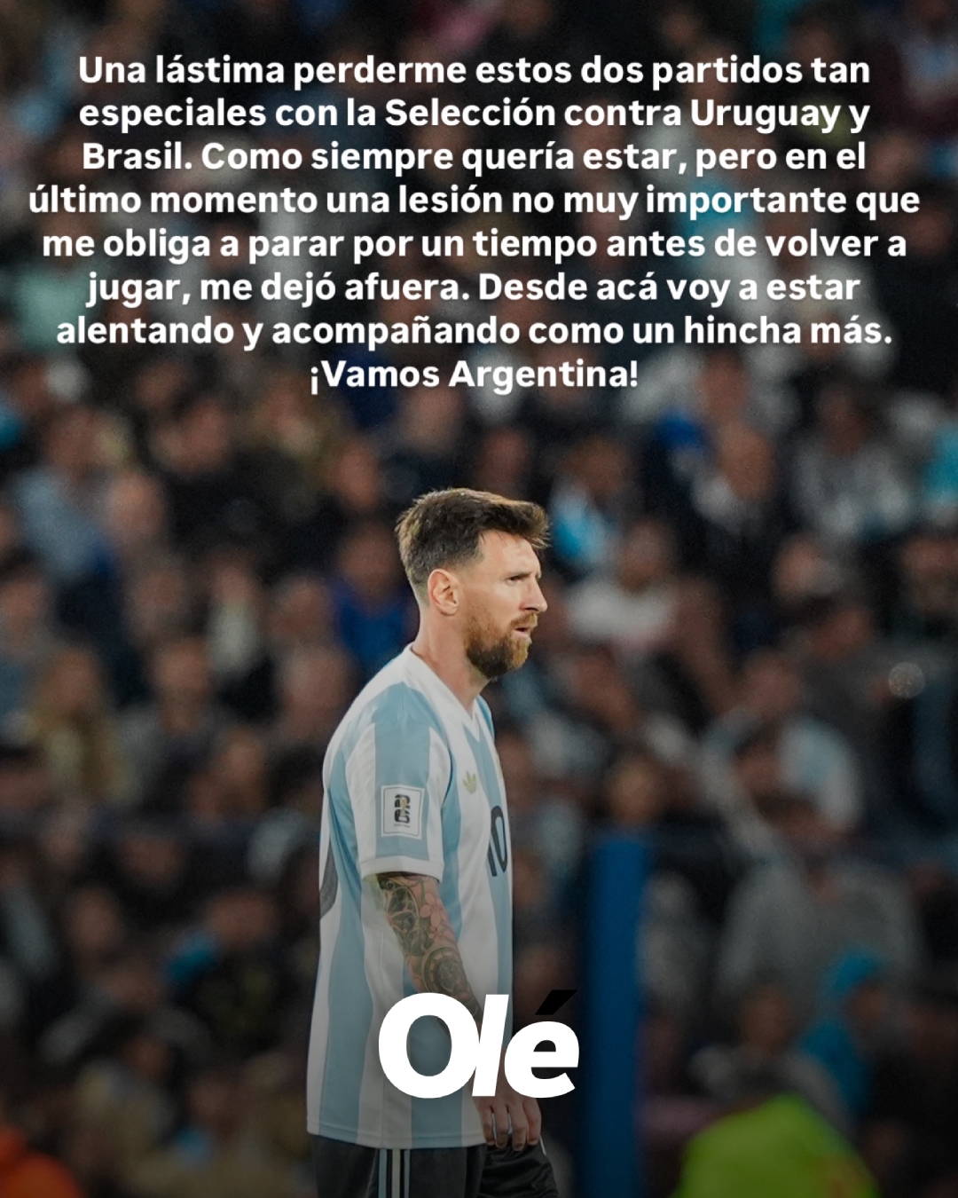 隨后,梅西在社媒上發文表示:“非常遺憾我將錯過與烏拉圭和巴西的兩場比賽。盡管我始終渴望參賽,但最后一刻出現的輕微傷勢迫使我必須休養一段時間才能重返賽場,這讓我無法參與此次賽事。在此我將作為一名普通球迷繼續為球隊加油助威。阿根廷加油!”
