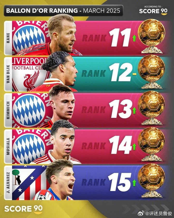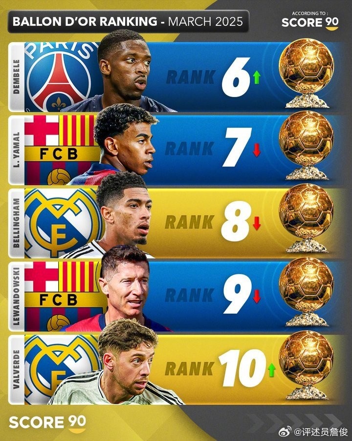 詹俊說:國外網(wǎng)站評分系統(tǒng)中2025年金球獎熱門人選前十五名。本季已經(jīng)打進(jìn)30球迎來個(gè)人職業(yè)生涯巔峰的登貝萊,會不會是“黑馬”?如果大巴黎本季歐冠最終捧杯的話……