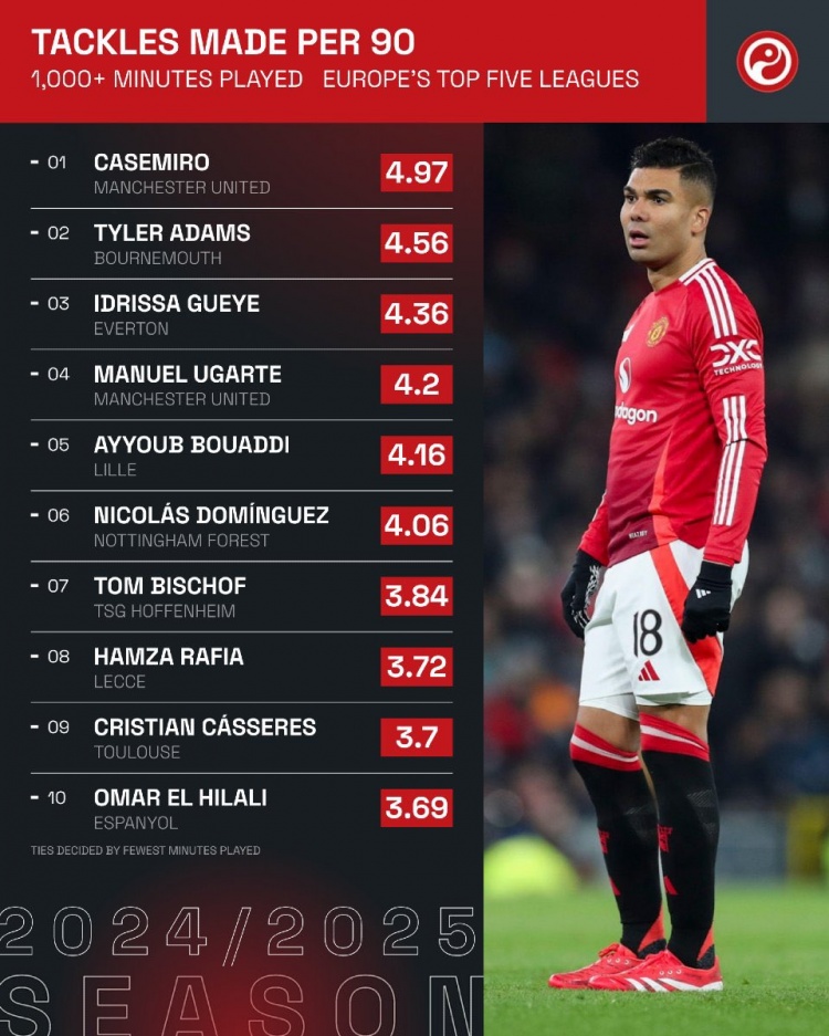 五大聯賽每90分鐘搶斷榜:卡塞米羅居首,亞當斯、蓋耶二三位?