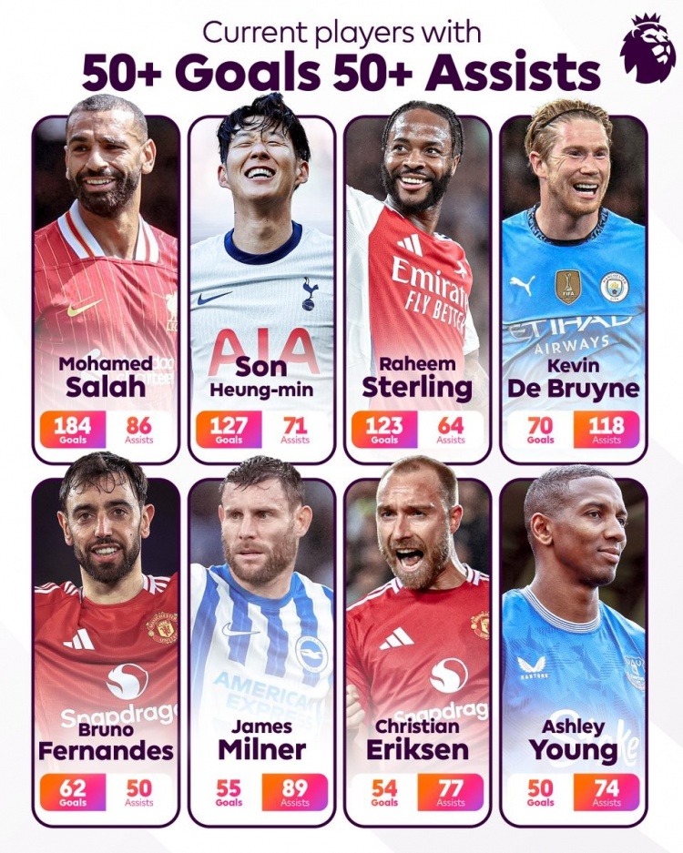 英超當前有8人進球助攻均50+:薩拉赫領銜,孫興慜、B費在列?