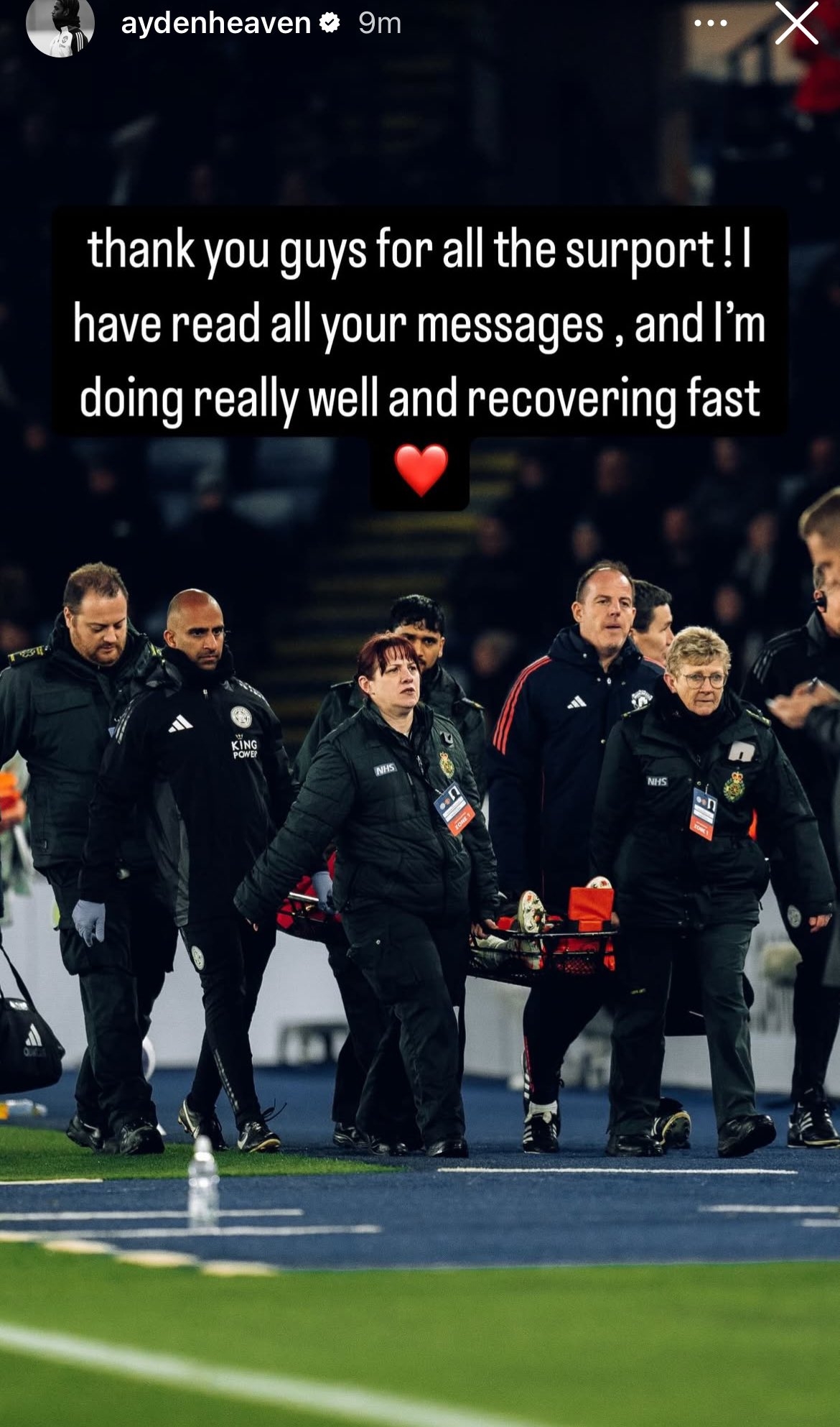 曼聯在本輪英超3-0客勝萊斯特城,18歲中衛海文首發因傷被擔架抬離球場。這名小將如今在社媒談到了自己的傷情。