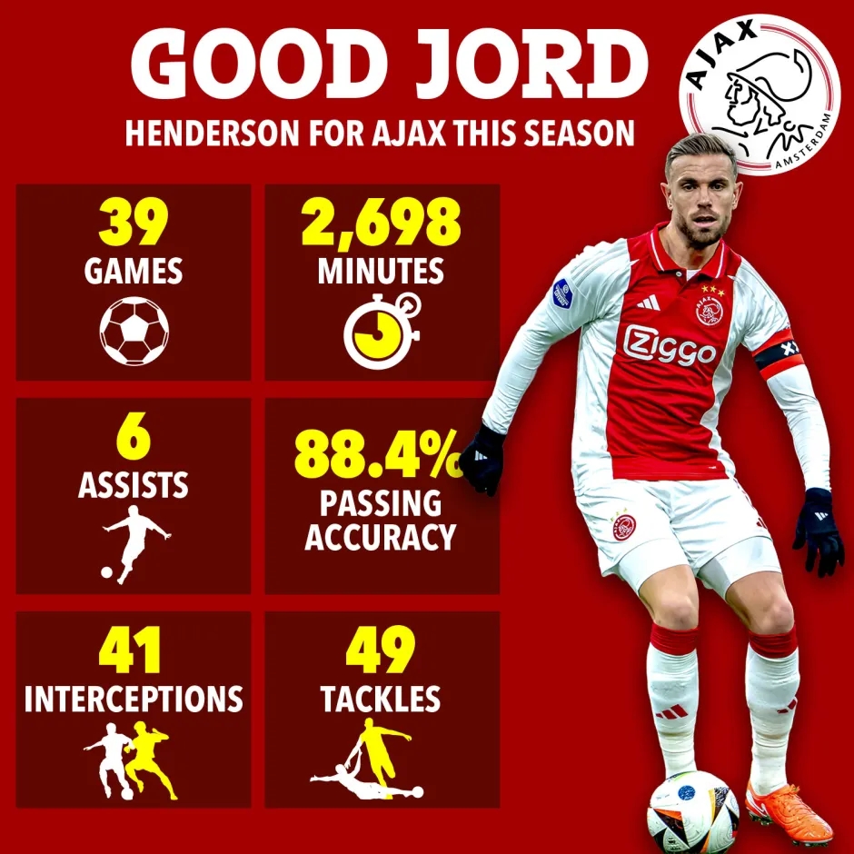 重返三獅軍團(tuán)!34歲亨德森本賽季為阿賈克斯出戰(zhàn)39次貢獻(xiàn)6次助攻?
