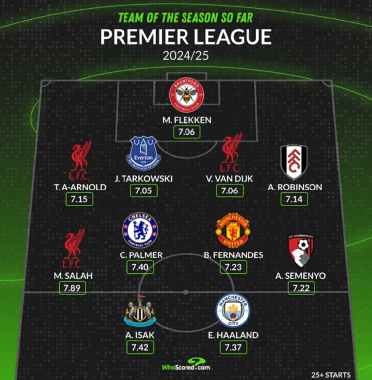Whoscored評本賽季英超至今最佳陣:薩拉赫領銜,哈蘭德&B費在列?