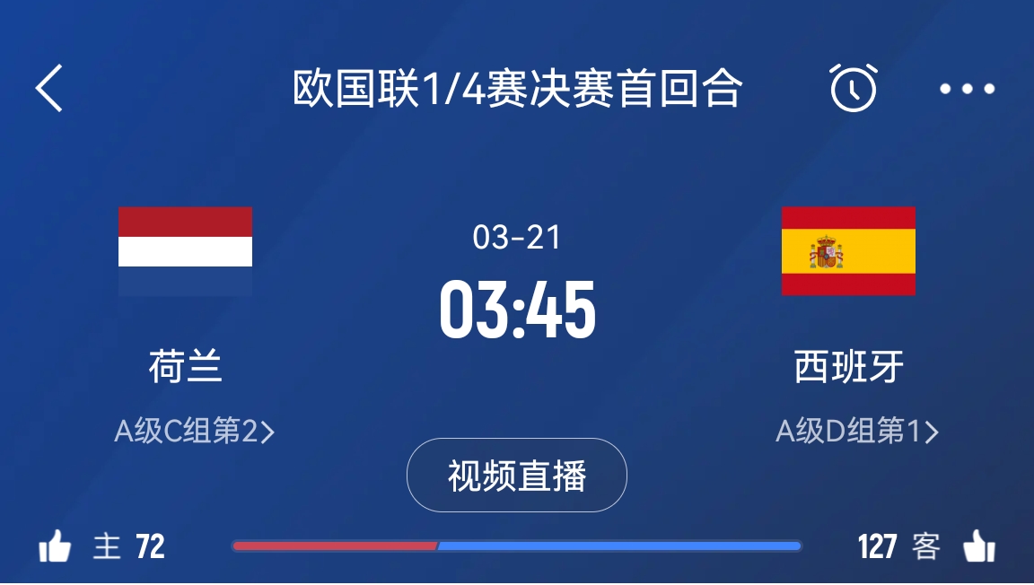 03月19日訊 3月21日凌晨3點(diǎn)45分,歐國(guó)聯(lián)1/4決賽首回合西班牙客場(chǎng)挑戰(zhàn)荷蘭。