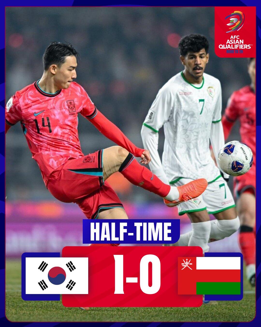 半場(chǎng)戰(zhàn)罷,韓國(guó)隊(duì)暫1-0阿曼隊(duì)。