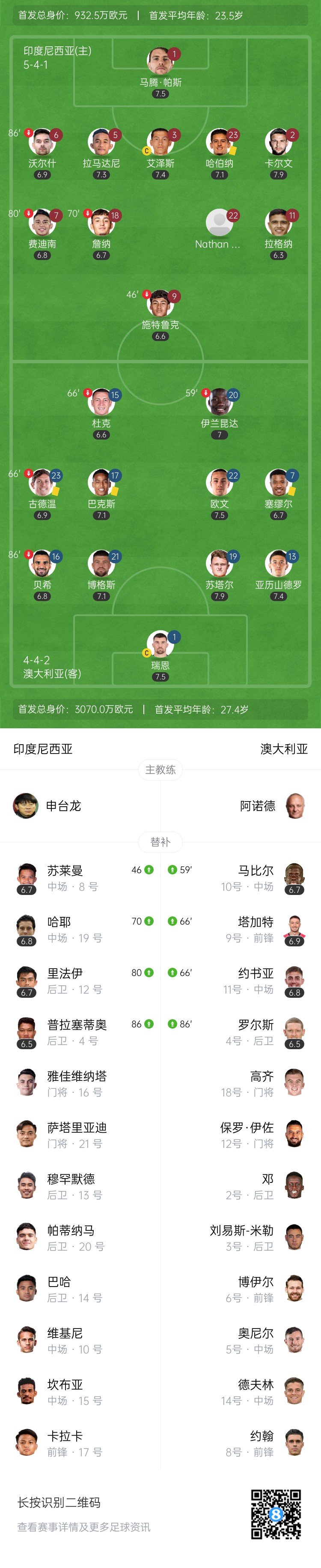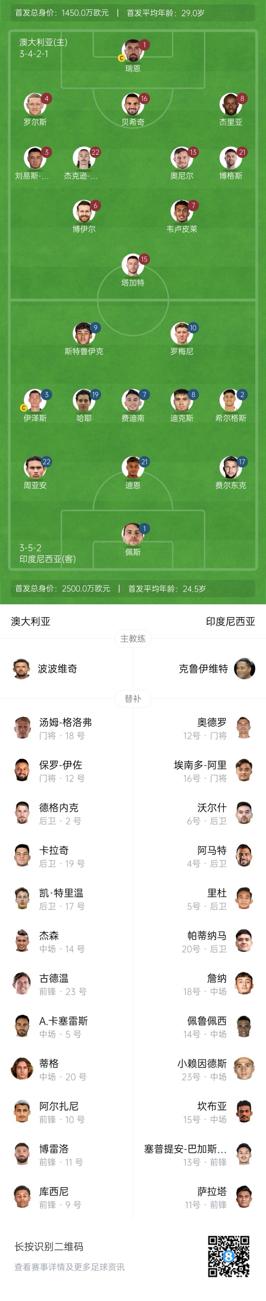03月20日訊 國(guó)足同組對(duì)手澳大利亞vs印尼首發(fā)出爐,而雙方的身價(jià)對(duì)比已經(jīng)發(fā)生了驚人的逆轉(zhuǎn)。