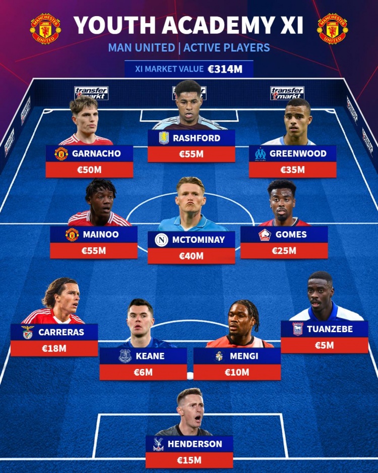 3月3日訊 德轉列出了曼聯、曼城和利物浦各自青訓出品球員的最佳陣容,其中,帕爾默、桑喬、斯特林、奧利塞等人入選。