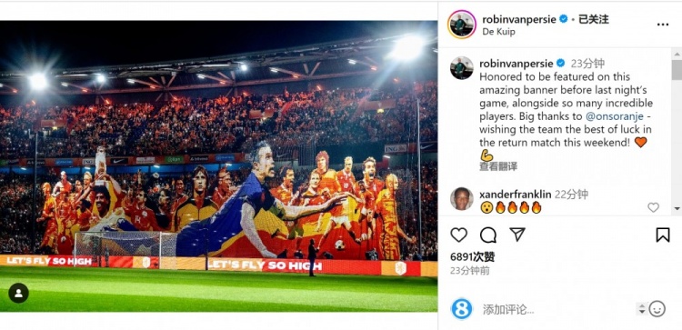 范佩西在社交媒體上曬出TIFO的照片,配文:“很榮幸能在昨晚的比賽前與這么多出色的球員一起出現在這幅令人驚嘆的橫幅上,非常感謝荷蘭隊——祝球隊在本周末的次回合比賽中好運!”