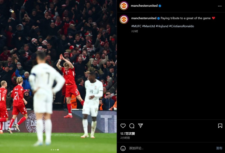 曼聯官方曬出了霍伊倫在C羅面前慶祝時的照片,并寫道:向偉大球員致敬?。