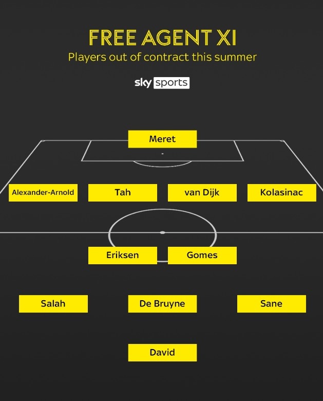 3月21日訊 天空體育列出今夏自由球員11人陣容,德布勞內、薩內在列,范迪克、阿諾德、薩拉赫三位利物浦球員同樣位列其中。