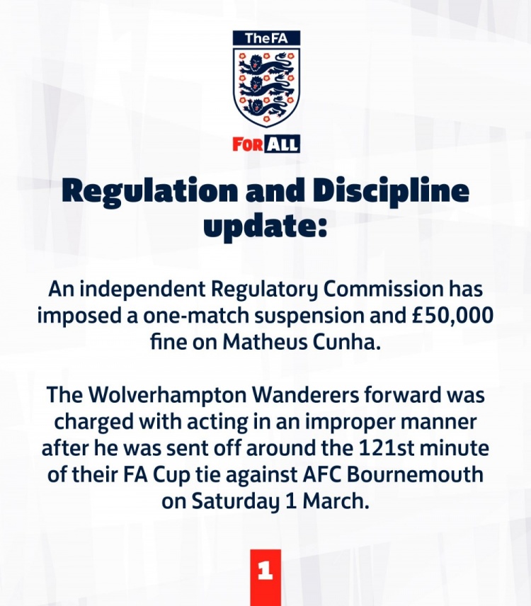 今天,英足總公布了對庫尼亞的罰單。英足總表示:“獨立調查委員會決定對庫尼亞追加禁賽一場、罰款5萬英鎊。在對陣伯恩茅斯的足總杯比賽中,這名狼隊前鋒在第121分鐘被罰下時出現不當行為。隨后,這名球員承認了指控。在4月13日星期日前,庫尼亞禁止參與英格蘭國內足球賽事。”