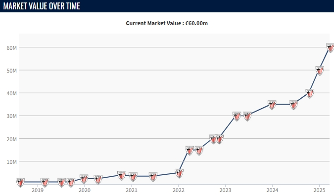03月21日訊 今日德轉更新西甲球員身價,24歲的畢爾巴鄂中場桑謝特上漲1000萬歐,身價來到6000萬歐,擠進西甲前15。