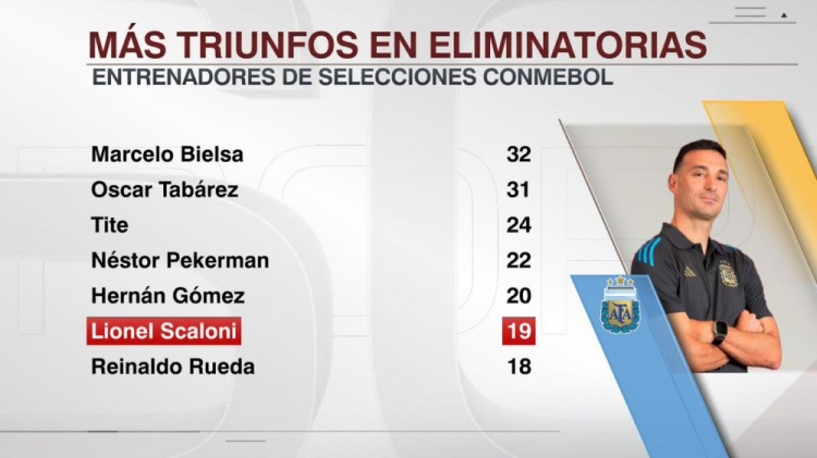 據ESPN統計,此役是斯卡洛尼帶領阿根廷隊在南美世預賽取得的第19場勝利,世預賽勝場數排名南美國家隊主帥第6位。