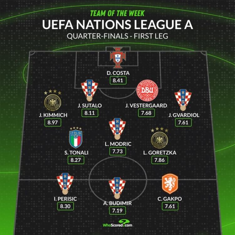 3月21日訊 歐國聯A級別八強戰首回合已經完賽,whoscored也列出了本輪評分最佳陣容,克羅地亞5將在列。