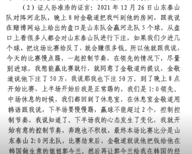 2021年12月26日山東泰山隊對陣河北隊,晚上8時金敬道把我叫到他的房間,跟我說在賭博網站上給出的盤口是山東隊會贏河北隊5個球,從盤口上看很多人都會對山東泰山隊進行下注,如果我們少進幾個球,把這場比賽給反了,就會賺很多錢。