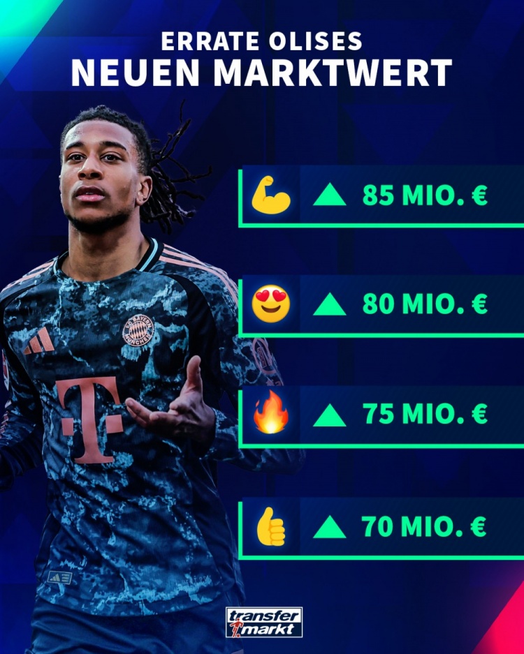 奧利塞目前的德轉(zhuǎn)身價為6500萬歐元,對于他接下來的最新身價,德轉(zhuǎn)給出了4個選項(xiàng),由低到高為7000萬歐、7500萬歐、8000萬歐、8500萬歐。