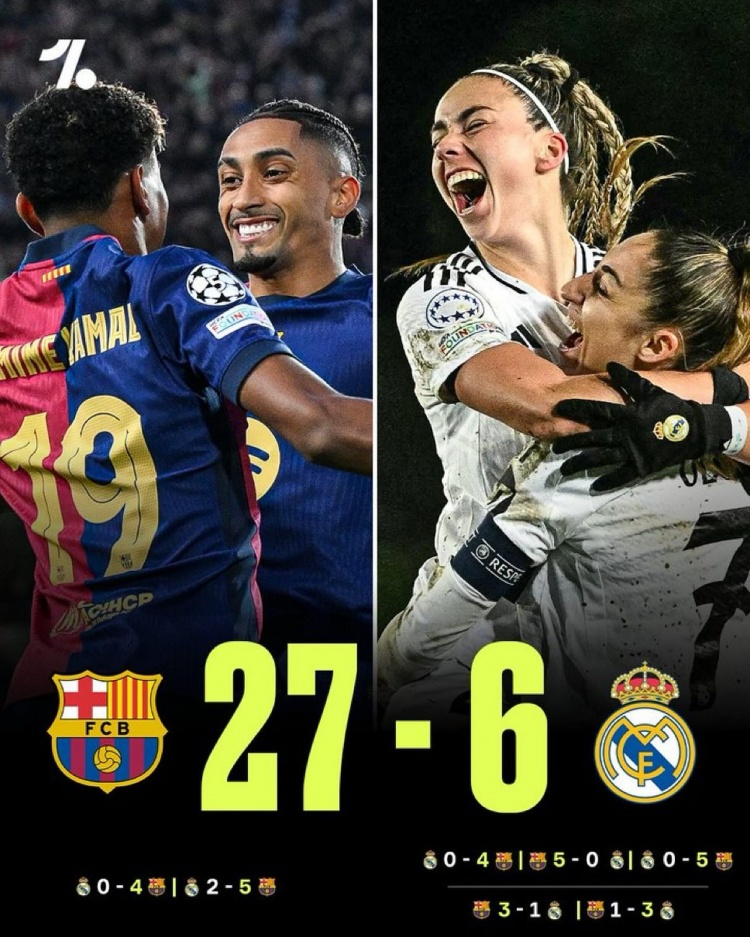 巴薩男女足本賽季對皇馬只輸了一場,7戰6勝1負共打進27球丟6球?