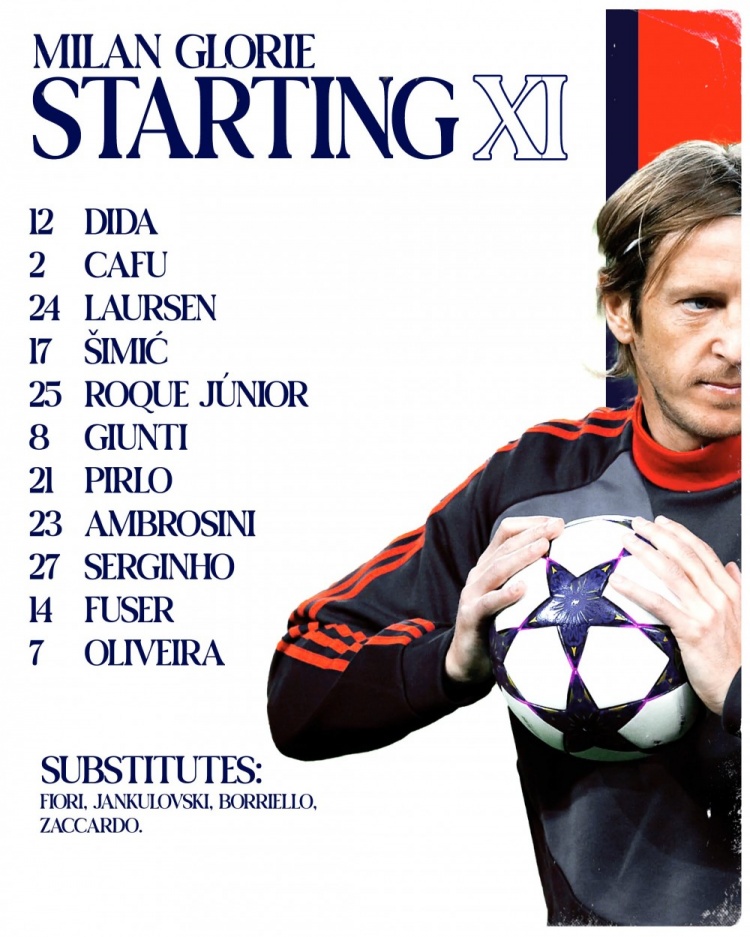 AC米蘭首發:迪達、卡福、勞爾森、西米奇、羅克-儒尼奧爾、吉恩蒂、皮爾洛、安布羅西尼、塞爾吉尼奧、福塞爾、奧利維拉