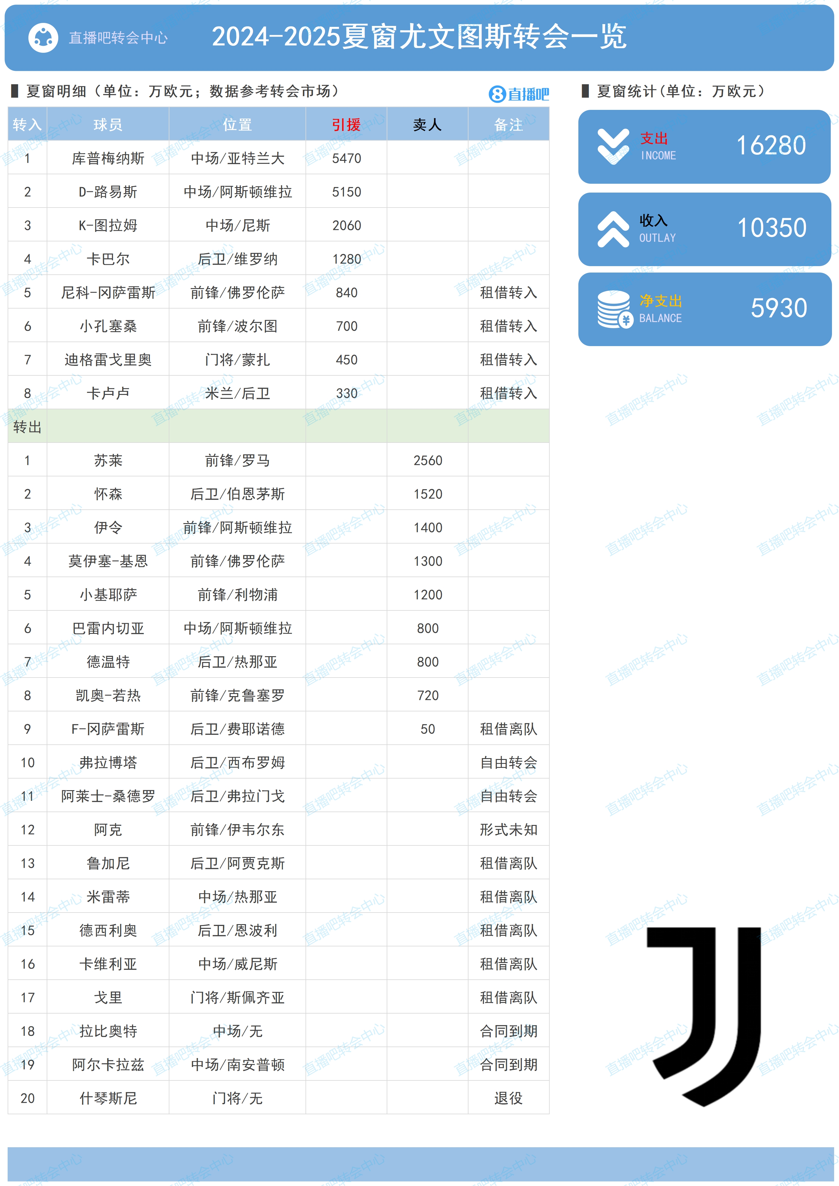 值得一提的是,尤文去年在夏窗可謂大換血,尤文圖斯共花費1.628億歐元,簽下了庫普梅納斯、道格拉斯-路易斯、K-圖拉姆等多名球員,另外通過出售蘇萊、懷森、伊令、小基恩、小基耶薩、巴雷內切亞等人收回1.035億歐元。這個夏窗尤文圖斯凈支出5930萬歐元。并且球隊送走了阿萊格里,迎來了新帥莫塔,可謂“重金重建”。