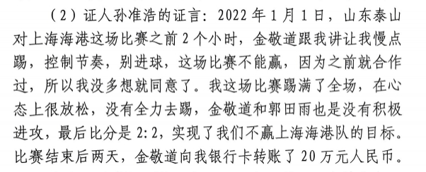 其中孫準浩的證言為:“2022年1月1日,山東泰山對上海海港這場比賽之前2個小時,金敬道跟我講讓我慢點踢,控制節奏,別進球,這場比賽不能贏,因為之前就合作過,所以我沒多想就同意了。我這場比賽踢滿了全場,在心態上很放松,沒有全力去踢,金敬道和郭田雨也是沒有積極進攻,最后比分是2:2,實現了我們不贏上海海港隊的目標。 比賽結束后兩天,金敬道向我銀行卡轉賬了20萬元人民幣。”