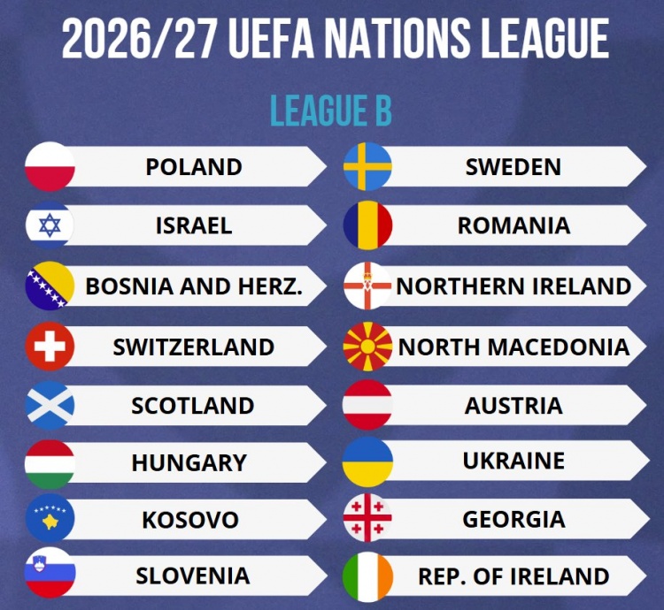 歐國聯2026-27賽季B級別球隊出爐:蘇格蘭、烏克蘭、波蘭在列?