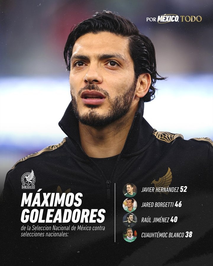 憑借著兩個進球,勞爾-希門尼斯以40球超越了夸烏特莫克-布蘭科,現在來到了墨西哥國家隊歷史射手榜第三的位置,僅次于46球的哈雷德-博爾格蒂和52球的“小豌豆”哈維爾-埃爾南德斯。