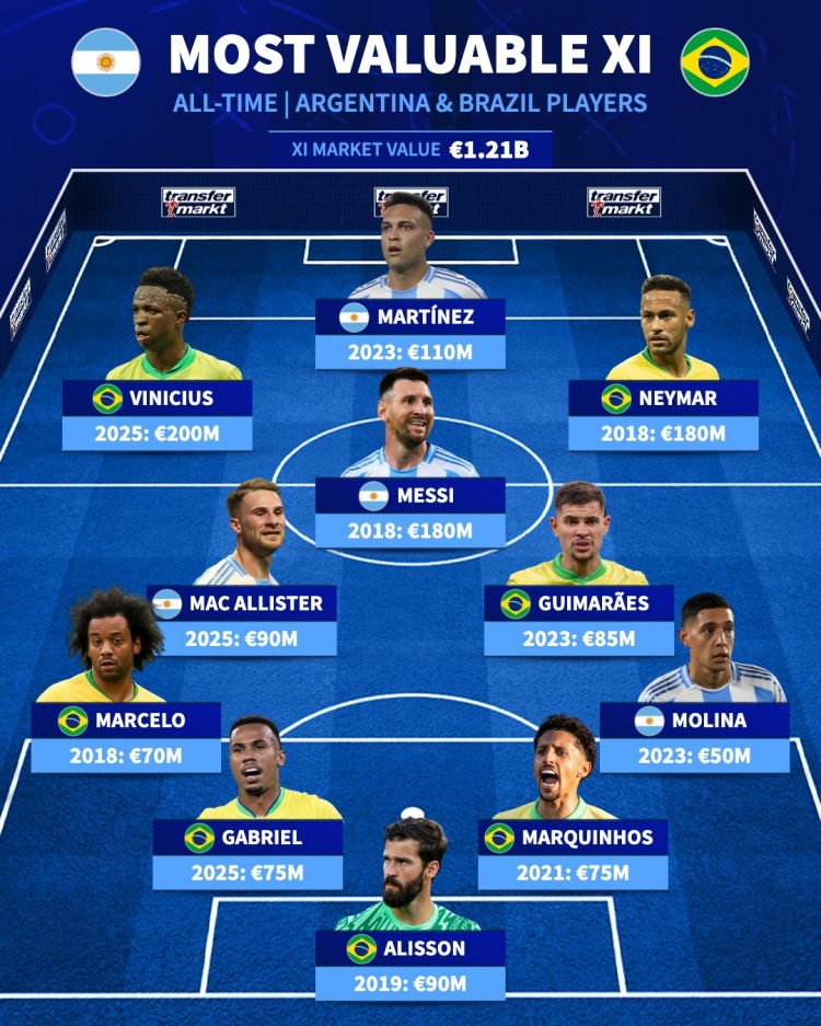 巴西+阿根廷德轉歷史最高身價陣容(總價12.1億歐)