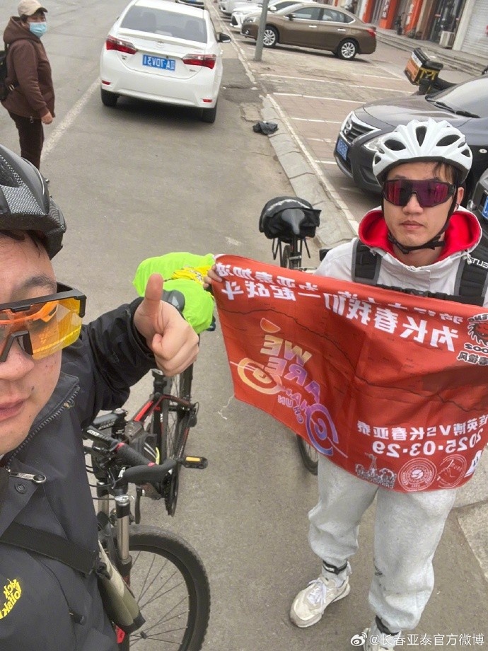 7天747公里,兩名亞泰球迷從長春騎行到大連為亞泰周六比賽助威?