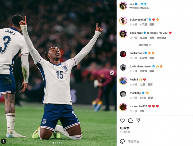 同場打進英格蘭隊處子球!里斯-詹姆斯&埃澤社媒曬照紀念?
