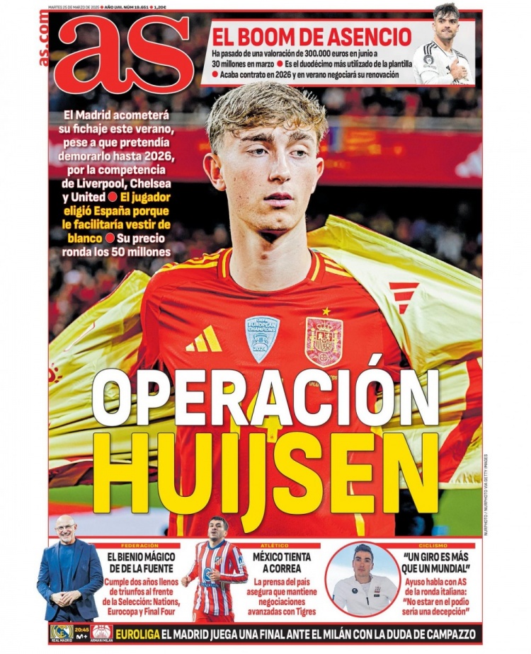 懷森成為《阿斯報》3月25日的封面人物,媒體指出,皇馬對這位19歲中衛感興趣,盡管伯恩茅斯打算將懷森留到2026年,但考慮到面臨利物浦、切爾西和曼聯的競爭,皇馬打算今夏就采取行動簽下他。
