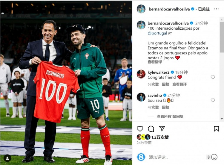 此役是B席為葡萄牙隊(duì)出戰(zhàn)的第100場(chǎng)比賽,因此獲贈(zèng)紀(jì)念球衣。他在社交媒體上曬出照片,并寫道:“為葡萄牙國(guó)家隊(duì)出戰(zhàn)100場(chǎng)比賽,我感到非常自豪和高興!我們進(jìn)入了四強(qiáng),感謝所有葡萄牙球迷在兩回合比賽中的支持。”