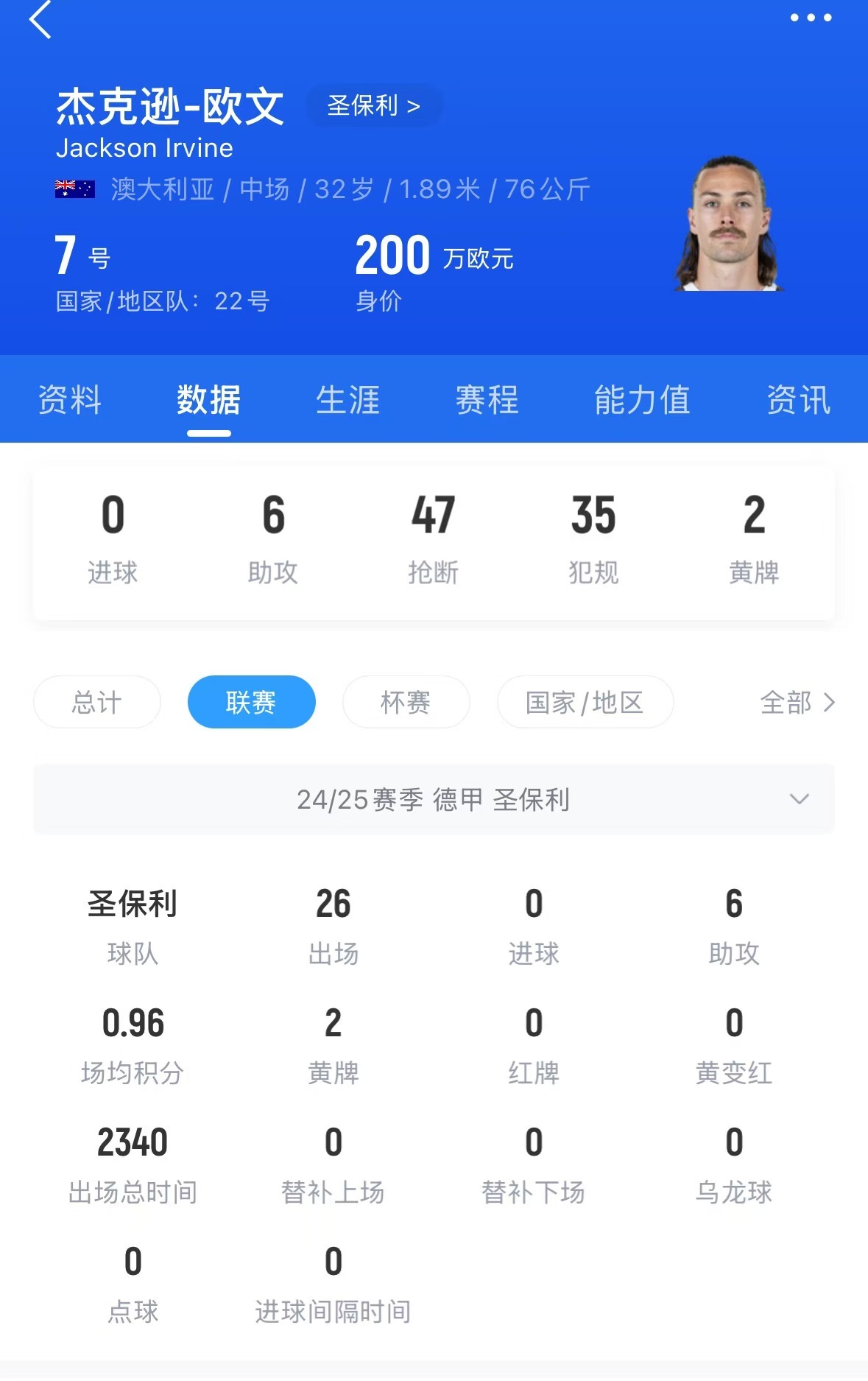 現年32歲的杰克遜-歐文目前效力于德甲圣保利,是球隊的主力和隊長,本賽季聯賽出場26次,并有6次助攻,目前德轉身價200萬歐元。
