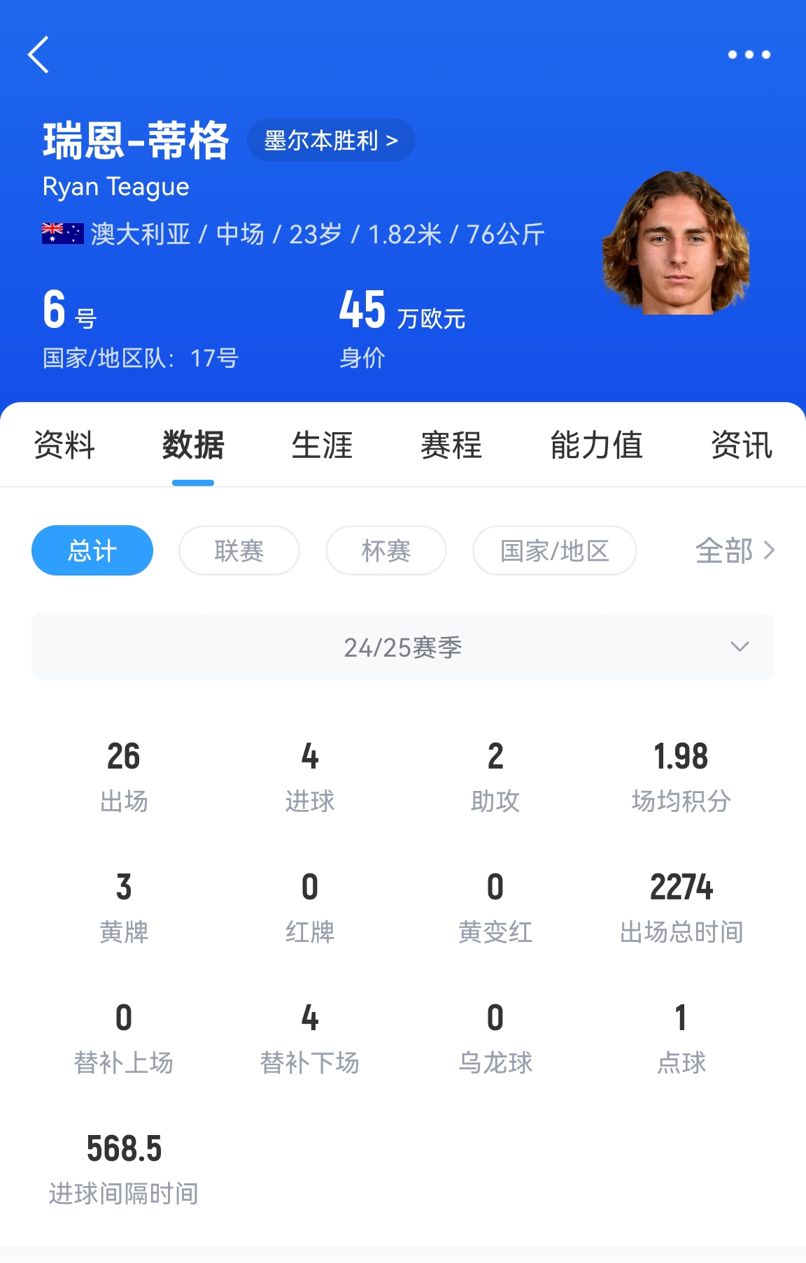 蒂格本賽季為墨爾本勝利出場26次打入4球2助攻,他的德轉身價為45萬歐元。