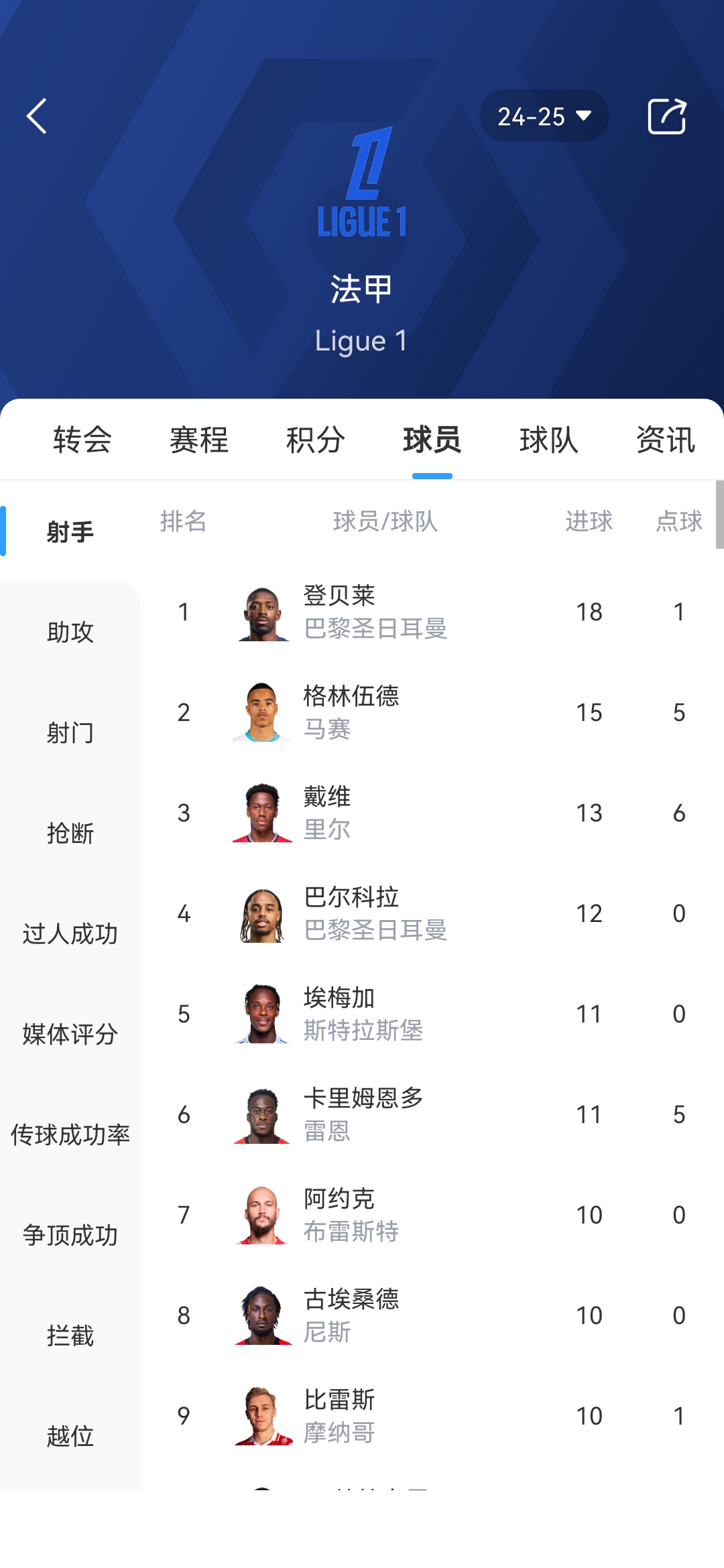 法甲射手榜: