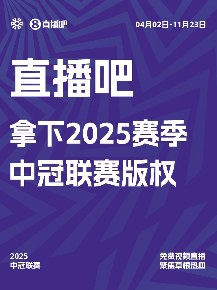 告訴吧友們一個(gè)好消息,我們拿到了2025賽季中國(guó)足協(xié)杯版權(quán)、2025賽季中國(guó)足球甲級(jí)聯(lián)賽版權(quán)、2025賽季中國(guó)足球乙級(jí)聯(lián)賽版權(quán)、2025賽季中冠聯(lián)賽版權(quán)。2025賽季,將全程免費(fèi)視頻直播足協(xié)杯、中甲、中乙、中冠四項(xiàng)賽事。上,高清比賽免費(fèi)看,與億萬(wàn)吧友同頻共振!