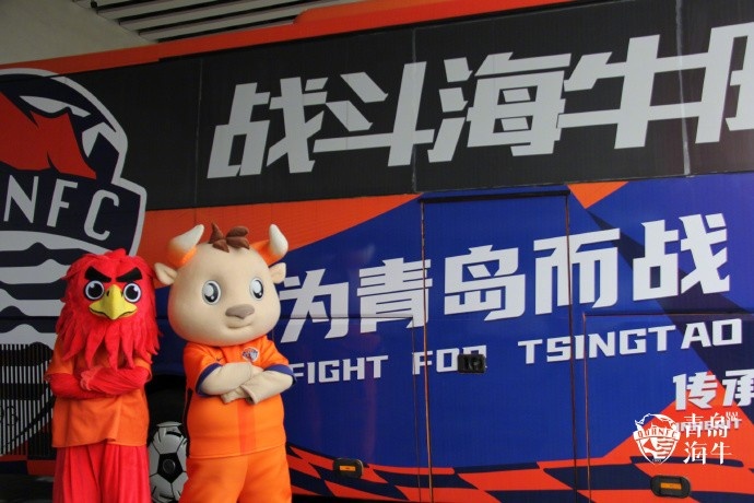同青島·共榮耀,在3月1日海牛主場迎戰深圳新鵬城的比賽中,不少國信男籃的球迷來到青春足球場為青島海牛加油助威,國信男籃的吉祥物“雄鷹”也與“犇犇”進行了親密的互動。