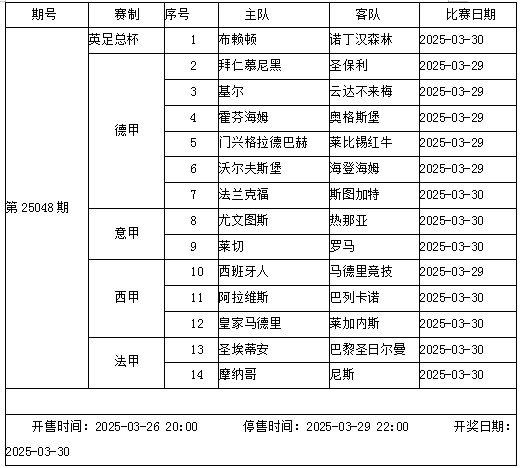本周末,歐洲各大聯(lián)賽陸續(xù)開(kāi)打。傳足勝負(fù)彩游戲第25048期競(jìng)猜對(duì)陣中,拜仁、尤文、馬競(jìng)和皇馬陸續(xù)出戰(zhàn)。國(guó)際比賽日后,需多留意“FIFA病毒”對(duì)俱樂(lè)部的影響。
