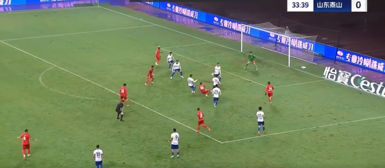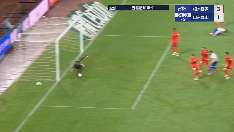 上半場補時第10分鐘,泰山隊扳回一球,陳蒲底線前傳球,卡扎伊什維利停下皮球后轉身打門得手,山東泰山1-3落后梅州客家。↓