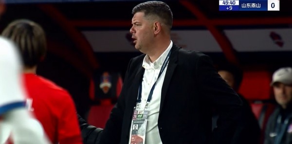 上半場補時第5分鐘,主裁判向梅州客家主帥米蘭-里斯蒂奇出示黃牌警告。↓