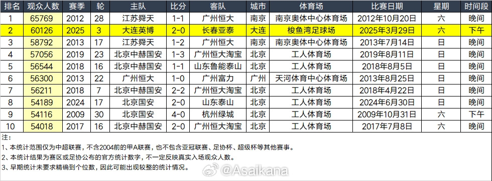 大連英博和長春亞泰吸引60126名觀眾現場觀戰,中超歷史排名第二