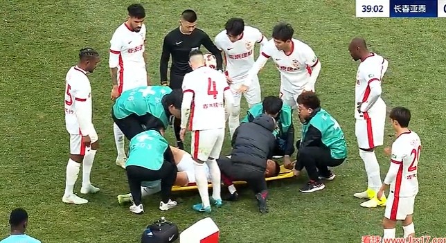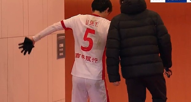 第38分鐘,譚龍拼搶中受傷倒地被擔架抬出場外,同時李申圓受傷堅持不住回更衣室。↓