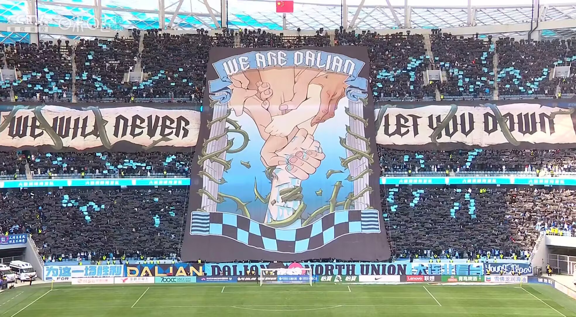 霸氣!東北德比前大連英博升起巨幅tifo——我們是大連