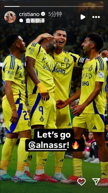 在個人社媒,C羅分享了一張利雅得勝利球員一起慶祝的照片,為球隊加油。本賽季,C羅已經為利雅得勝利出戰30次,貢獻25球4次助攻。