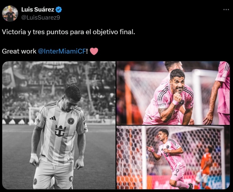 蘇亞雷斯也在賽后通過社媒曬出自己的慶祝照,并配文:“勝利與通向最終目標的關鍵3分。全隊的表現很棒@邁阿密國際俱樂部。”