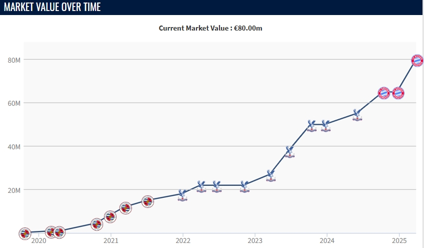 2024年夏窗,拜仁花費(fèi)5300萬(wàn)歐元從水晶宮簽下奧利塞,合同簽至2029年6月。本賽季奧利塞代表拜仁出戰(zhàn)41場(chǎng)比賽,貢獻(xiàn)13粒進(jìn)球和13次助攻。