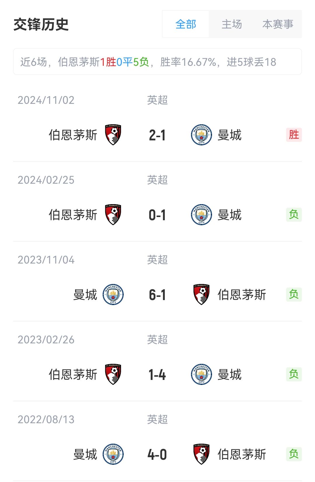 而在英超方面,曼城14勝6平9負,積48分排名第5,伯恩茅斯則是12勝8平9負,積44分排名第10。