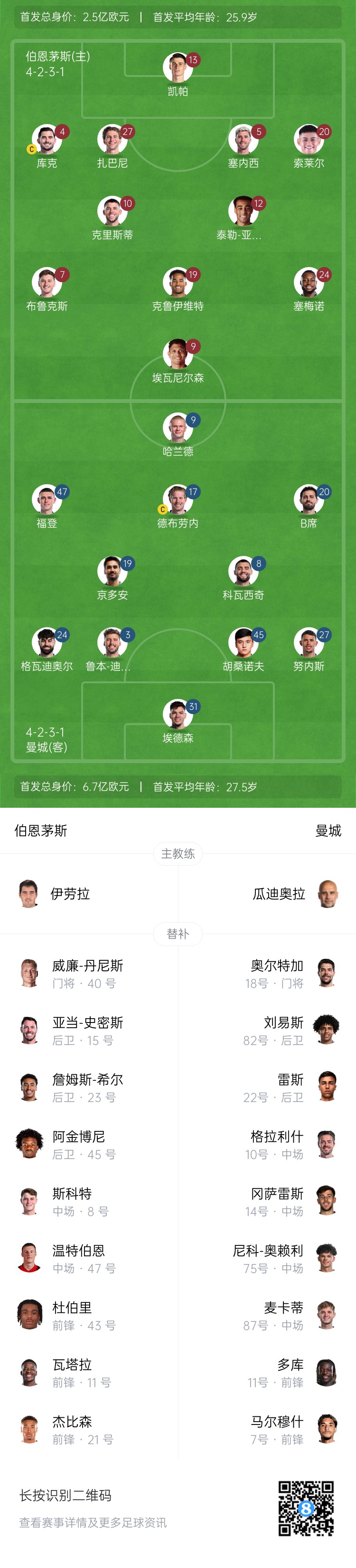 曼城首發:31-埃德森、27-努內斯、45-胡桑諾夫、3-魯本-迪亞斯、24-格瓦迪奧爾、19-京多安、8-科瓦西奇、17-德布勞內、20-B席、47-福登、9-哈蘭德