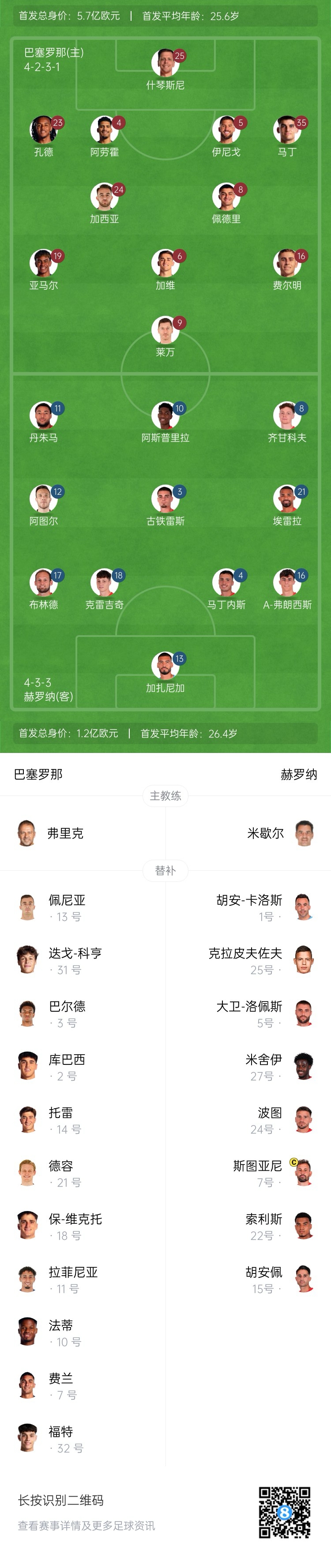 巴薩替補:13-佩尼亞、31-迭戈-科亨、2-庫巴西、3-巴爾德、14-巴勃羅-托雷、18-保-維克托、21-德容、7-費蘭-托雷斯、10-法蒂、11-拉菲尼亞、32-赫克托-福特