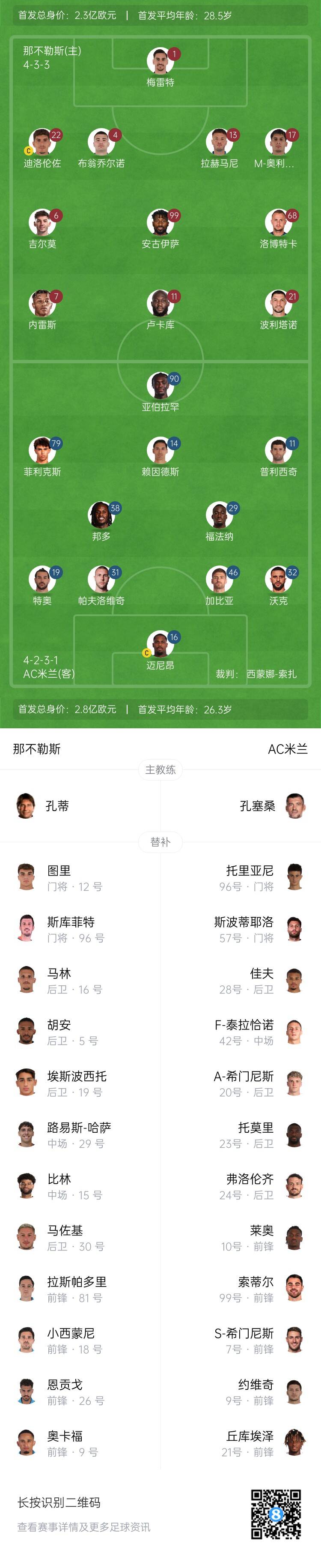 3月31日訊 意甲第30輪,那不勒斯主場對陣AC米蘭。賽前,官方公布了本場的首發名單。