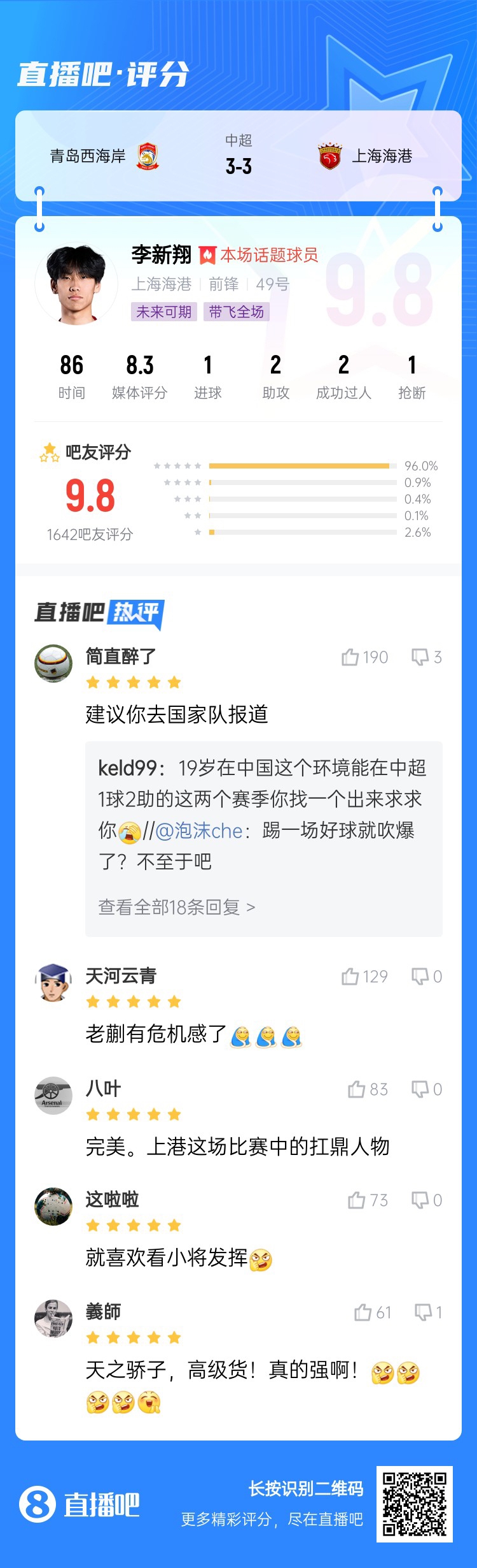 19歲的海港“小孩哥”中超首次先發(fā)1射2傳,讓衛(wèi)冕冠軍極限客場(chǎng)戰(zhàn)平西海岸,似乎又讓球迷看到了一顆未來(lái)冉冉升起的新星,看到新的希望!